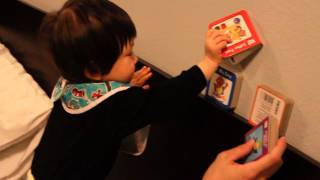 Stacking books on bed headboard @ 14 months